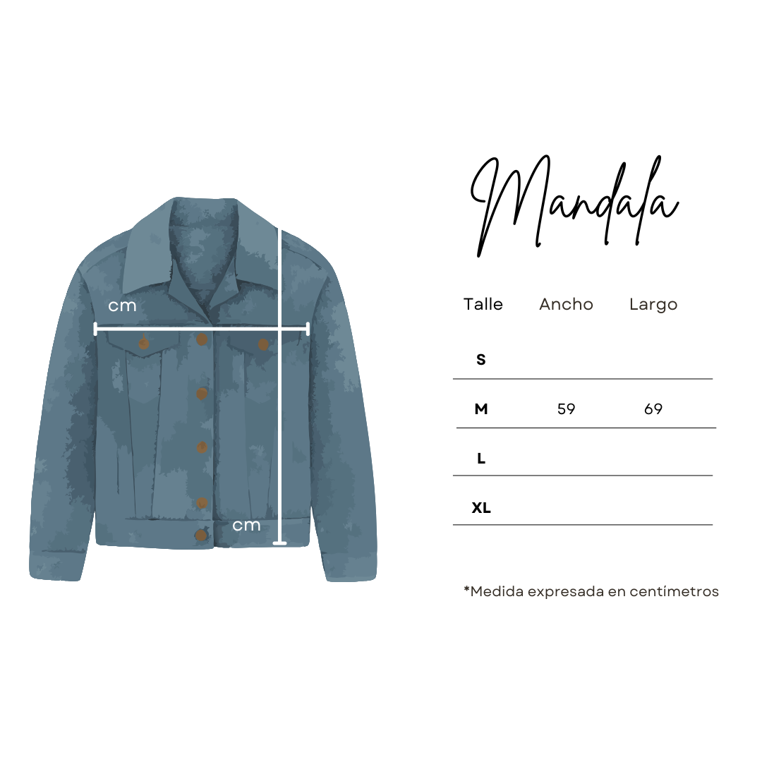 Confecccionada en jean rígido negro, Mandala se destaca por su bordado central de alto impacto visual, inspirado en formas florales y geométricas que evocan equilibrio, armonía y fuerza interior.